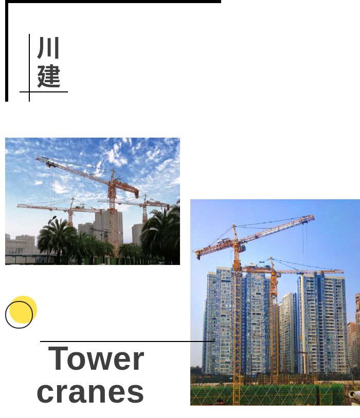 川建M1000塔式起重機(jī)起重臂長(zhǎng)70米,最大吊重50噸,端部吊重12噸,塔身截面4米;川建C8039塔式起重機(jī)起重臂長(zhǎng)80米,最大吊重25噸,端部吊重3.9噸,塔身截面2.5米;兩種機(jī)型均具有行走式、固定式兩種基礎(chǔ)形式。